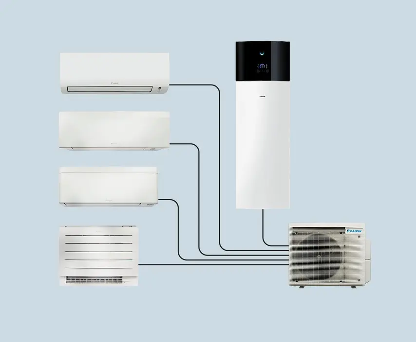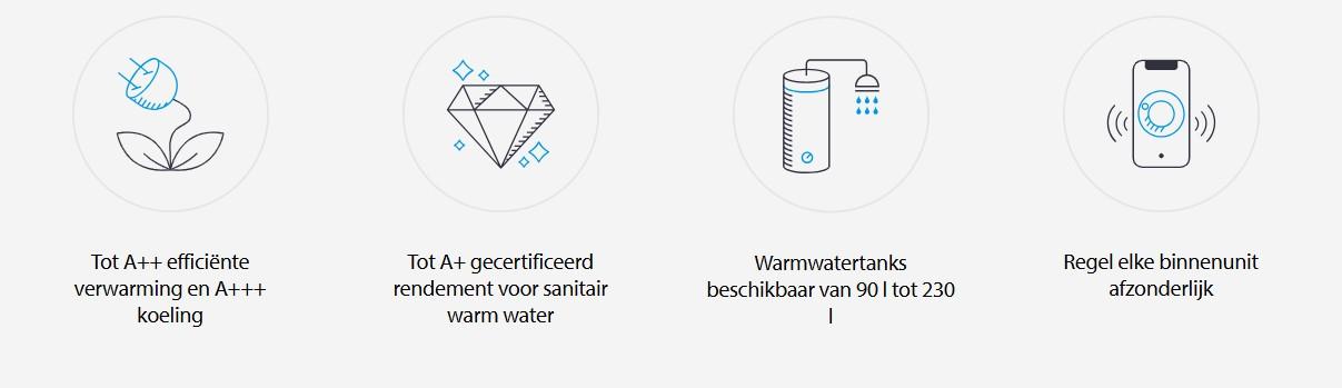 Verwarmen en koelen van je woning en productie van warm water voor je bad en douche door één enkele buitenunit aan te sluiten op maximaal vier binnenunits en een tank voor sanitair warm water